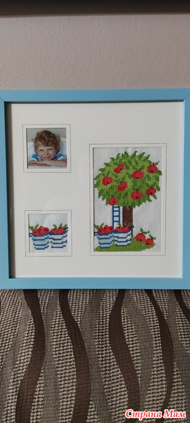Хоть работа и маленькая, но следили за каждым крестиком, чтобы все смотрели в одну сторону. На изнанке есть протяжки, хотя мы стремились к идеальной. Работа поедет на местную выставку. При оформлении добавили ещё мини мотив: