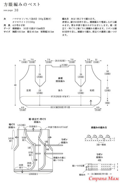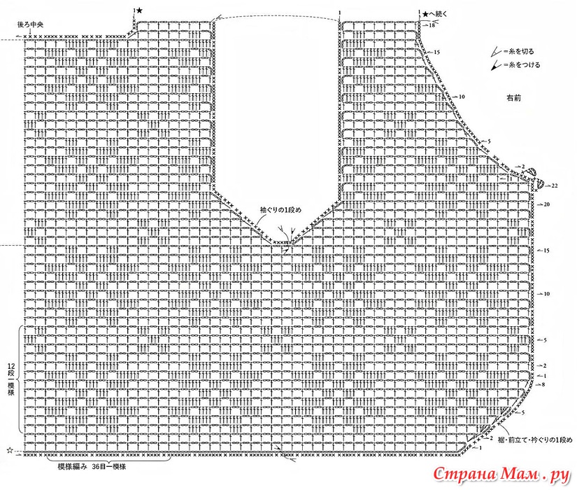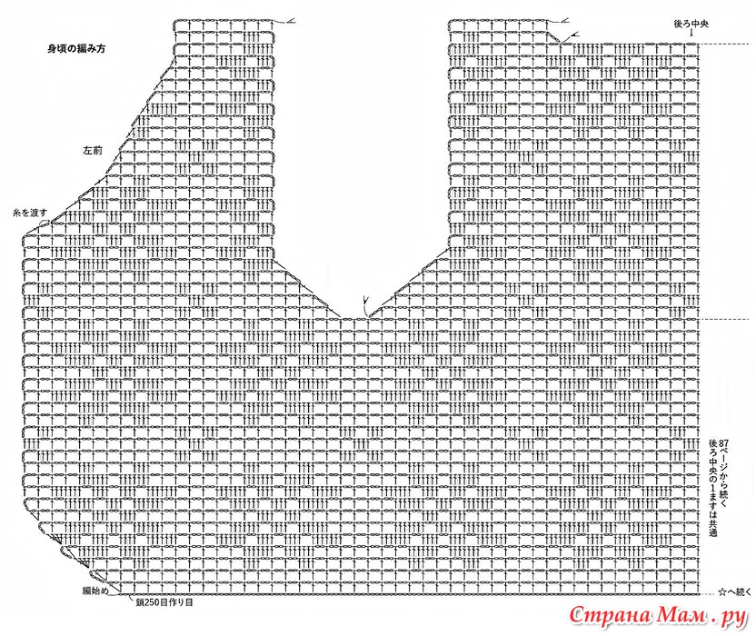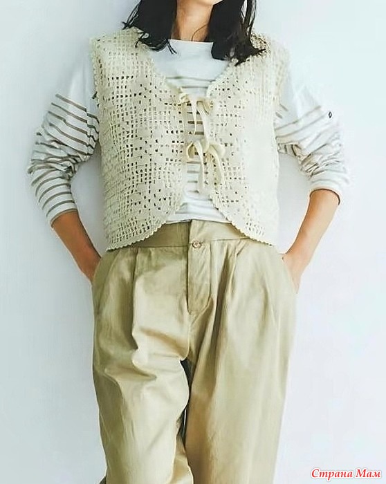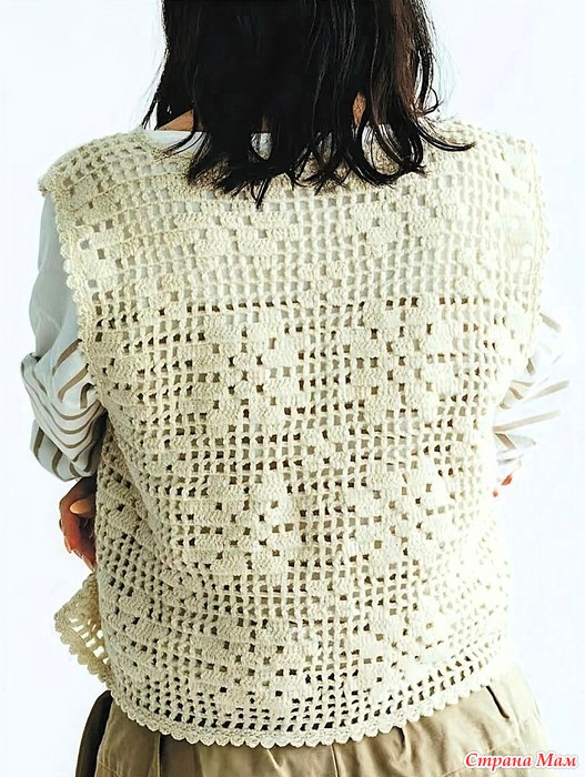Для основной части наберите 250 воздушных петель и провяжите узором, прибавляя и убавляя петли. Расположив лицевые стороны друг к другу, обшейте плечи. Свяжите кайму по низу, планке, вырезу горловины и проймам. Для ленты наберите 80 воздушных петель и провяжите столбиками без накида, затем пришейте к изнаночной стороне планки.