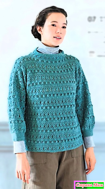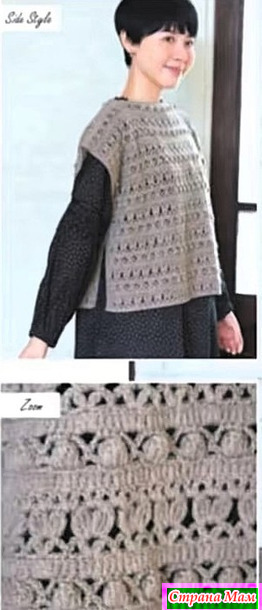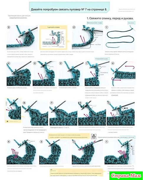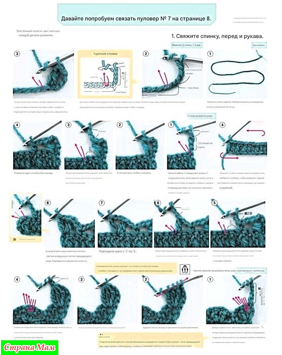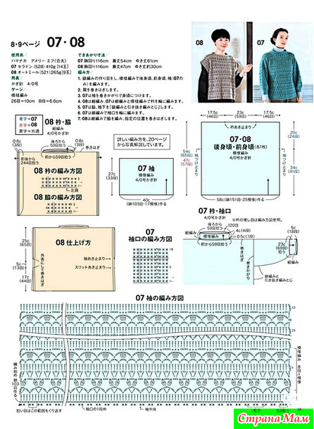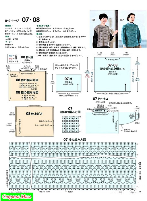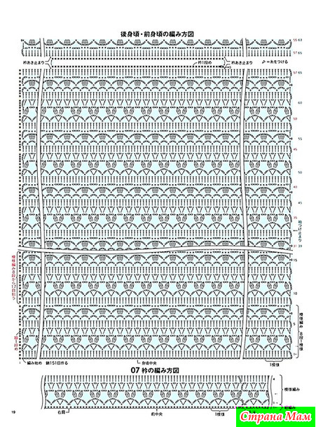 1. Наберите воздушную петлю и свяжите спинку, переднюю часть и рукава (только модель 07) узорчатыми петлями.