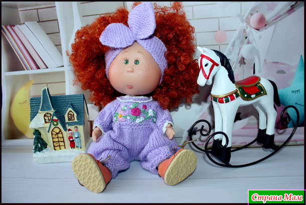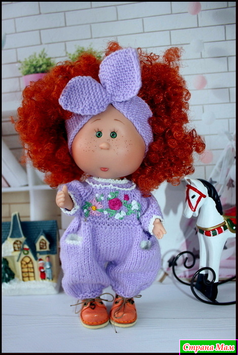 Подарили внучке на Новый год чудесную малышку Мию мини.Рост куколки 23 см.Теперь привезли ее мне,чтобы я навязала для нее разной одежки.Начало положено-связался комбинезончик и повязка на голову.Оставался небольшой клубочек сиреневх ниточек Карамелька от Камтекс,вот я и решила их пристроить.Комбинезон вязала спицами 3 мм,повязку спицами 2 мм.Цветочки вышивала мулине. Сделала прорезные кармашки.