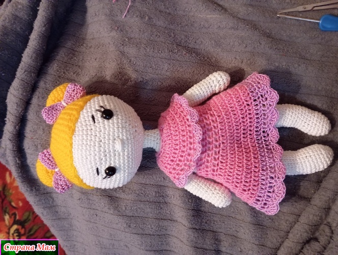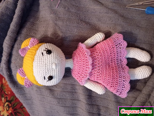 Именно в этой группе я начала засматриваться на красоток. Потихоньку из- под крючка у меня начали появляться игрушки. Это прям медитации. Только сейчас довязала эту милашку.