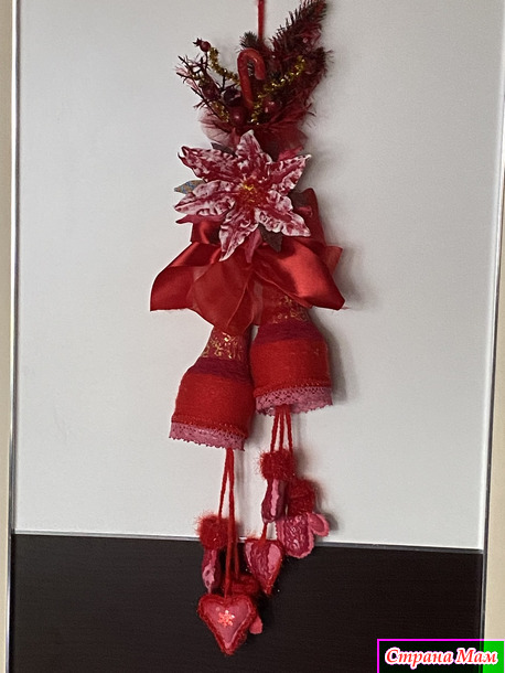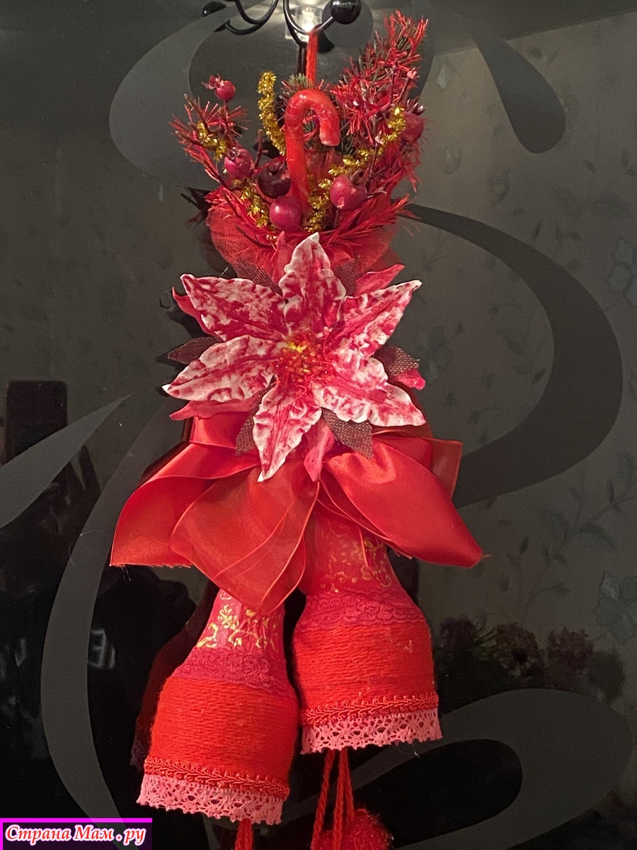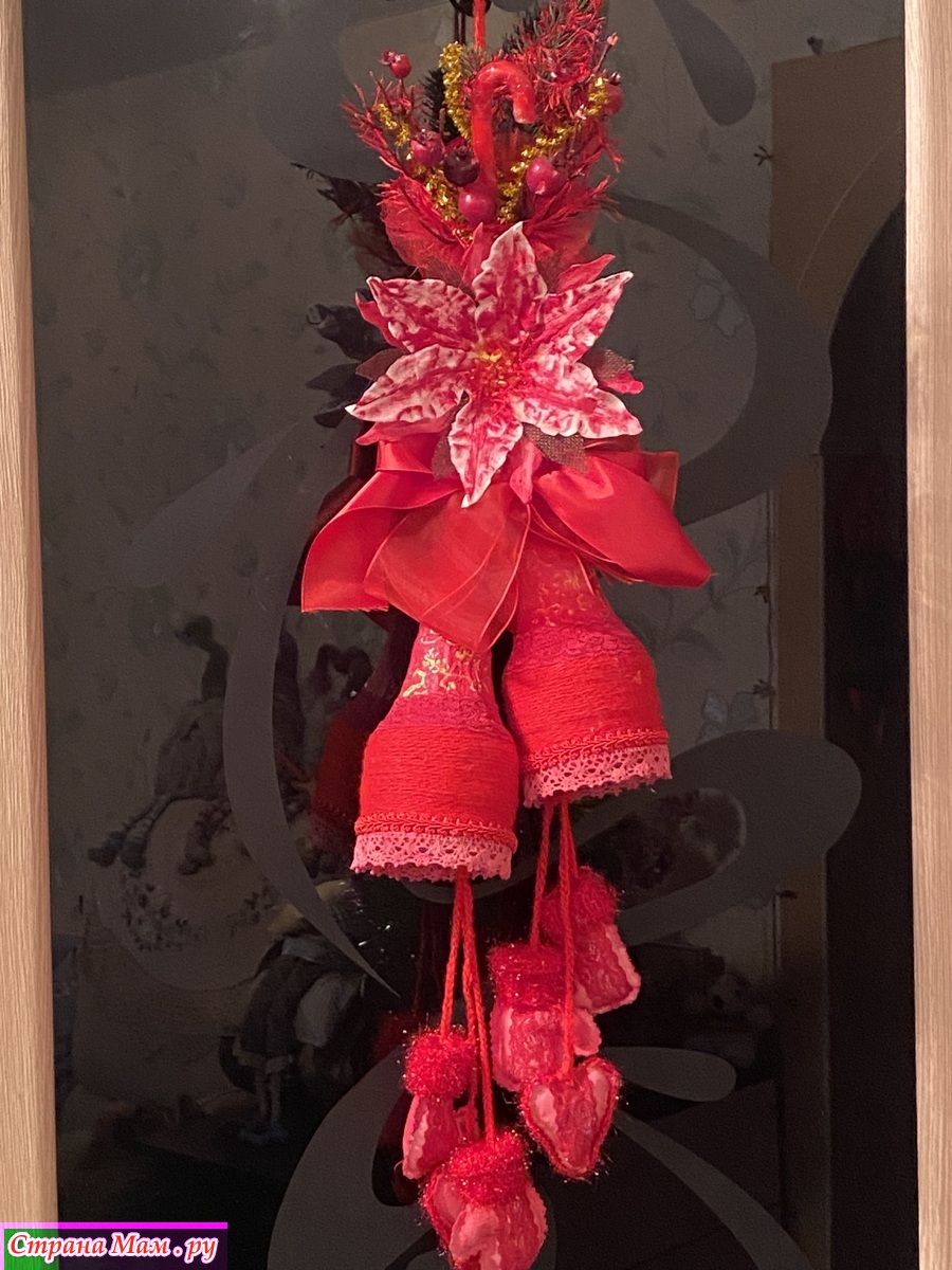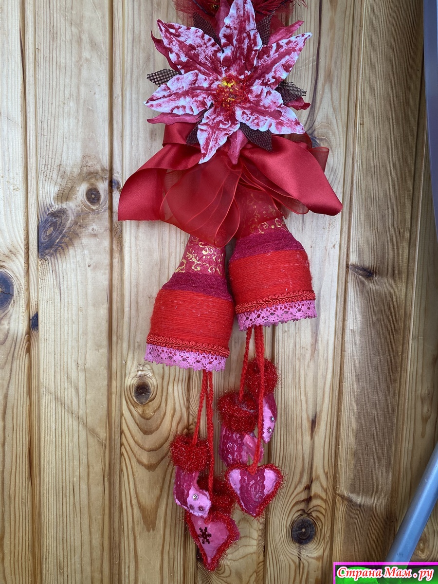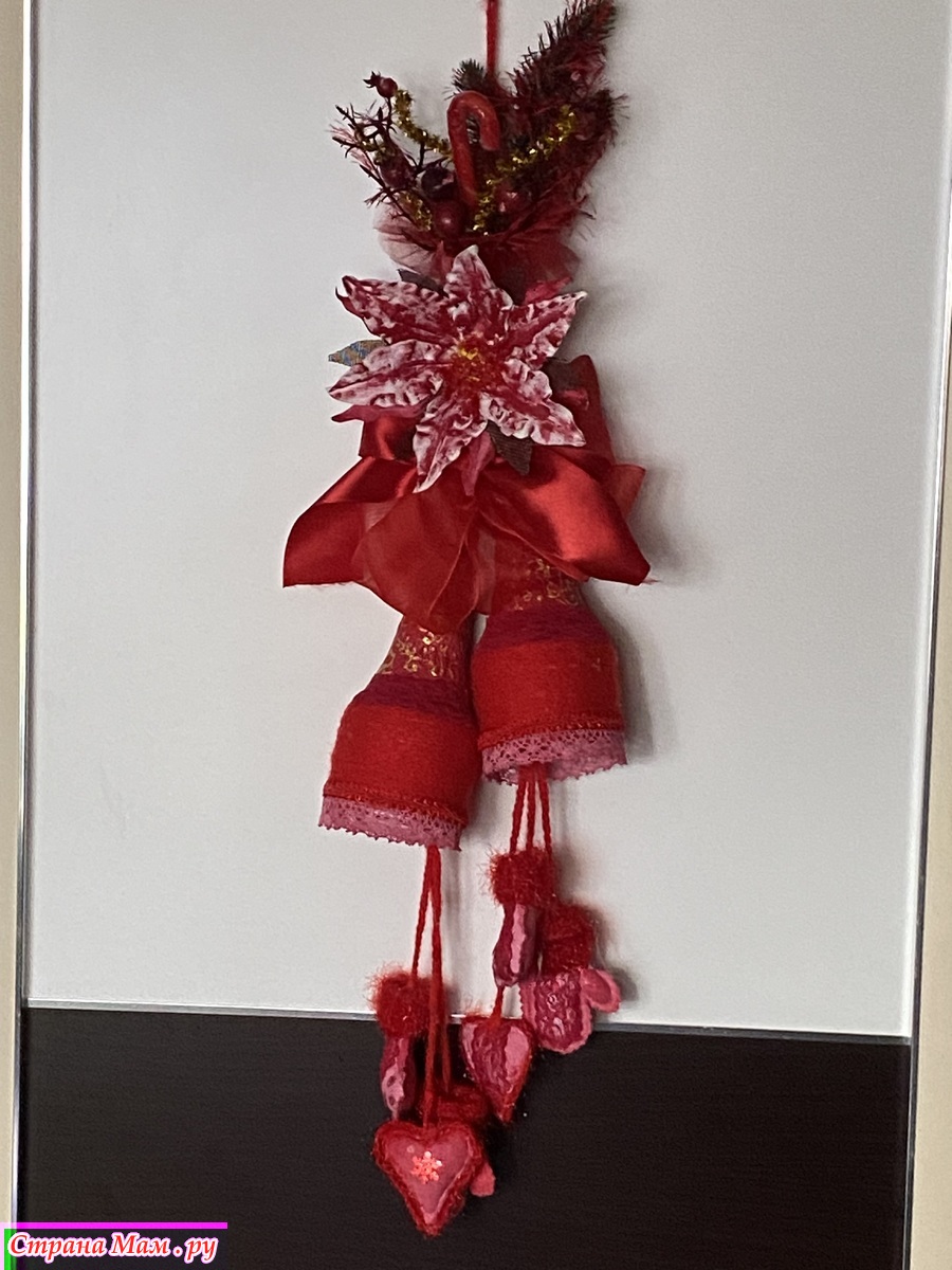 Собрала по дому все что могла! Куски лент, небольшие фрагменты кружев( не всегда красные, но быстро покрашенные акриловыми красками), небольшие остатки всяких украшений. Тоже все подкрасила. Цветок, типа, пуансетии, сделала из ватных дисков и клейстера. Тоже покрасила акриловыми красками. Нижний подвес сшила из бязи, покрасила. Добавила вязаных и кружевных фрагментов. Колокольчики обернула акриловой пряжей, немного откорректировала форму и расписала. Все собрала воедино и оп-ля - получилось яркое и праздничное украшение.