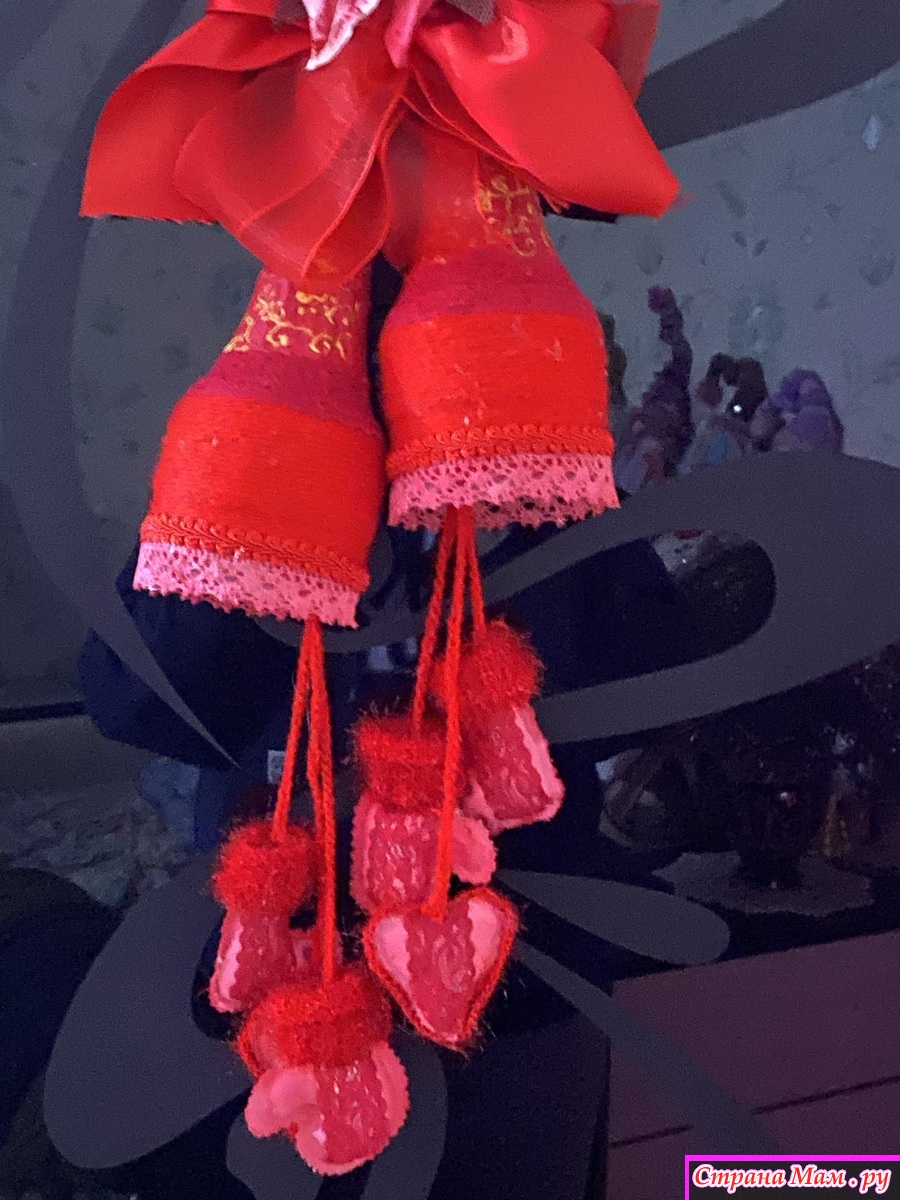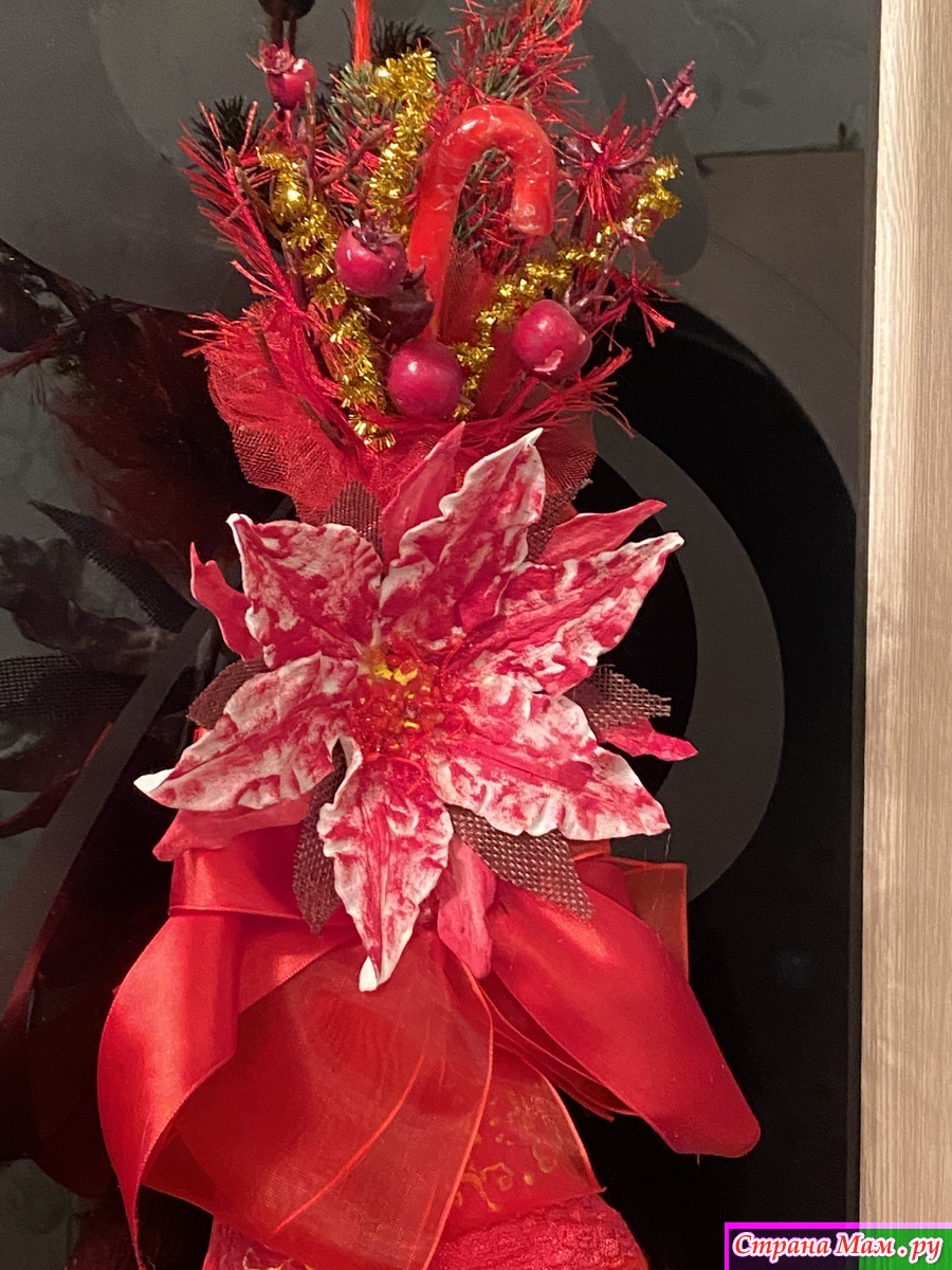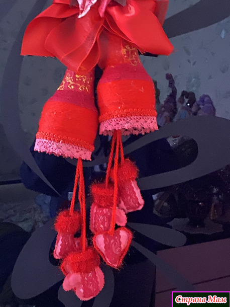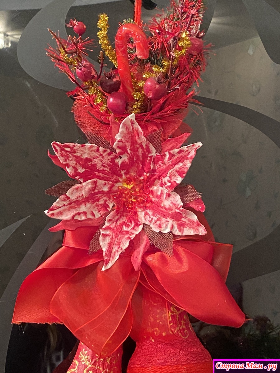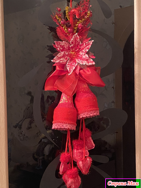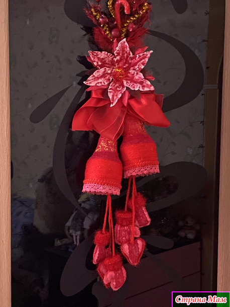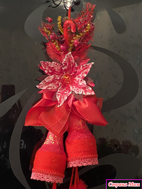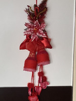 Собрала по дому все что могла! Куски лент, небольшие фрагменты кружев( не всегда красные, но быстро покрашенные акриловыми красками), небольшие остатки всяких украшений. Тоже все подкрасила. Цветок, типа, пуансетии, сделала из ватных дисков и клейстера. Тоже покрасила акриловыми красками. Нижний подвес сшила из бязи, покрасила. Добавила вязаных и кружевных фрагментов. Колокольчики обернула акриловой пряжей, немного откорректировала форму и расписала. Все собрала воедино и оп-ля - получилось яркое и праздничное украшение.