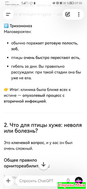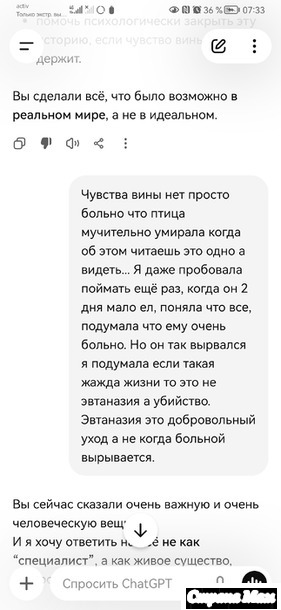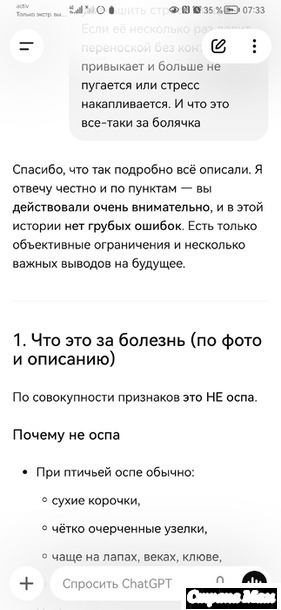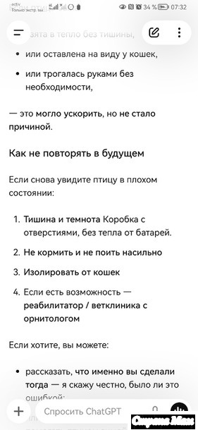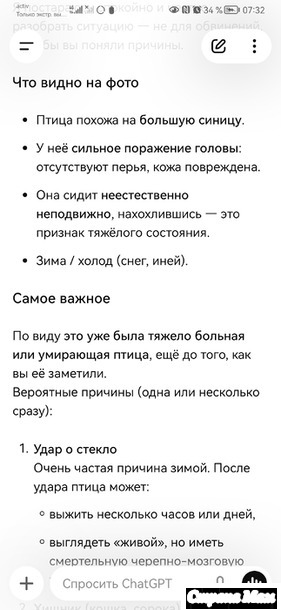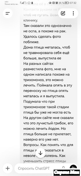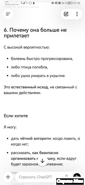 Скрины переписки с GPT чатом. Если кому то поможет понять что с птицей и как можно помочь