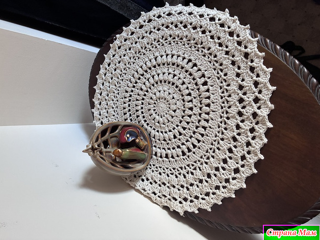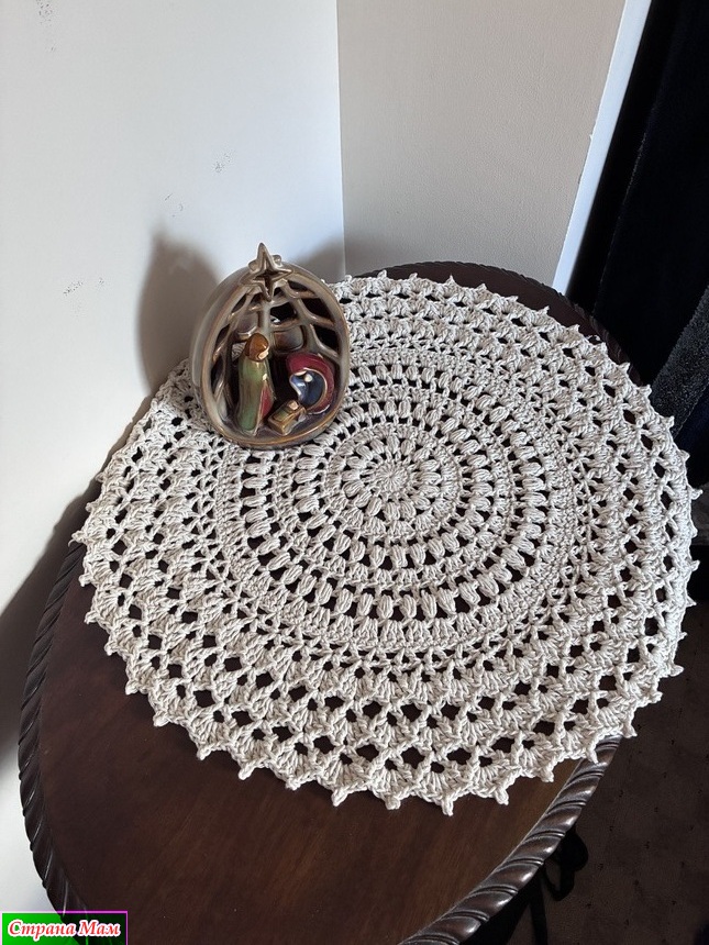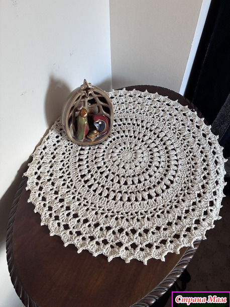 Тогда я взяла толстую пряжу и по описанию салфетки получилась скатерть. Небольшая, правда.