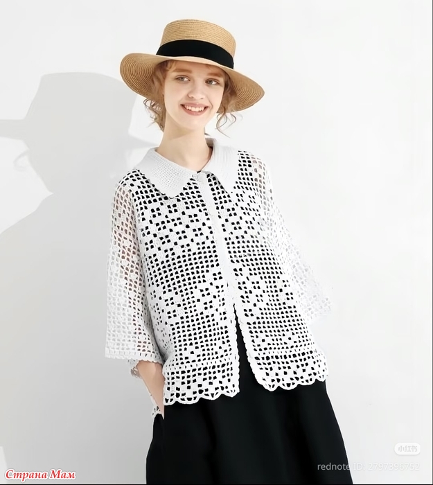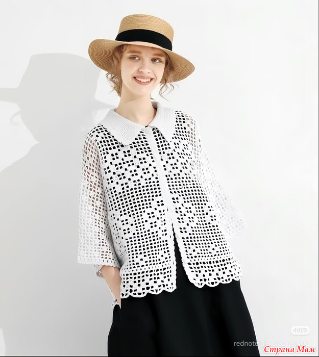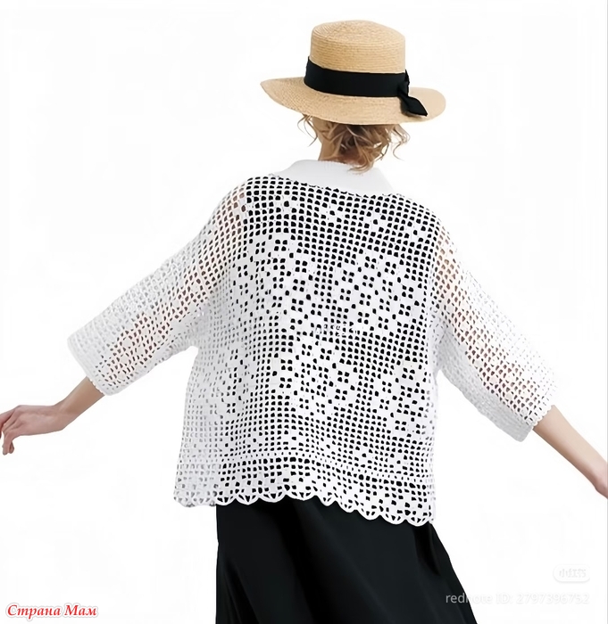 Хлопковый жакет свободного силуэта в филейной технике.