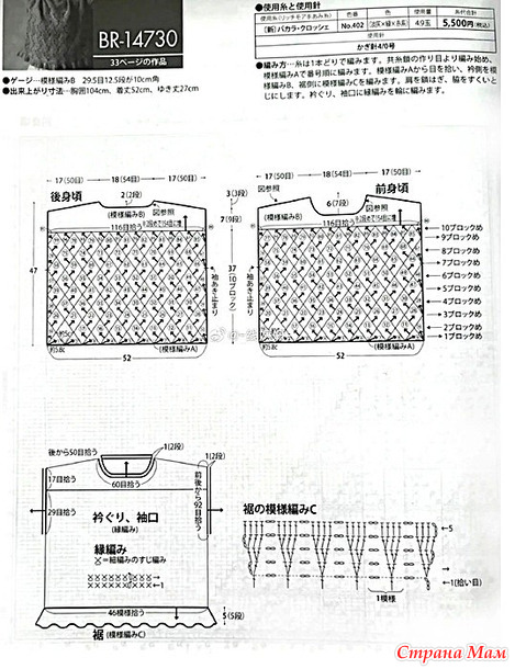 Плотность вязания: узор B, 29,5 дней, 12,5 рядов, квадрат 10 см.