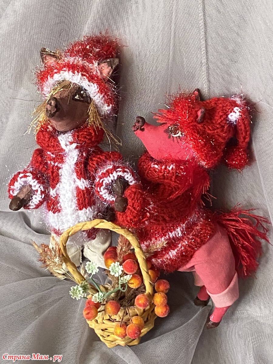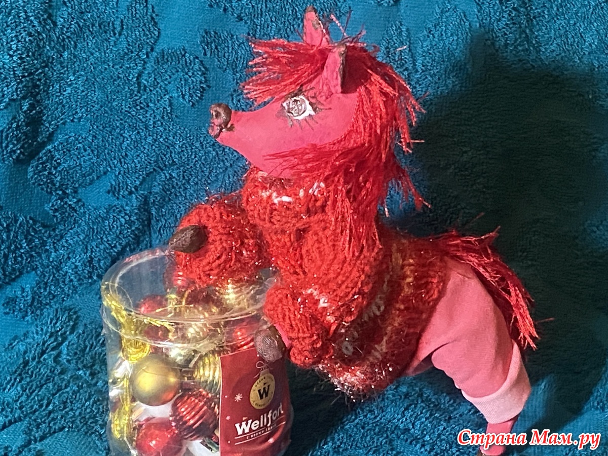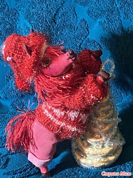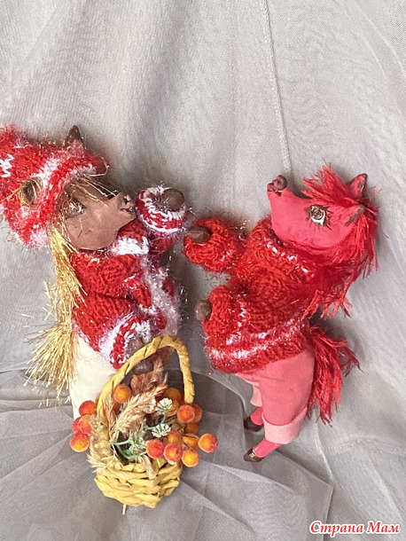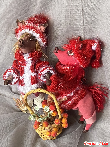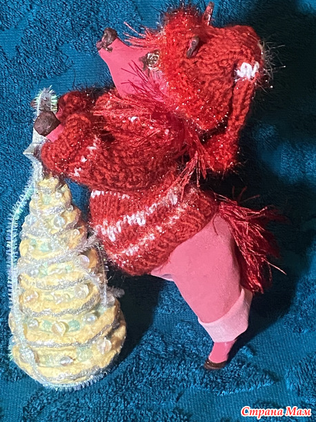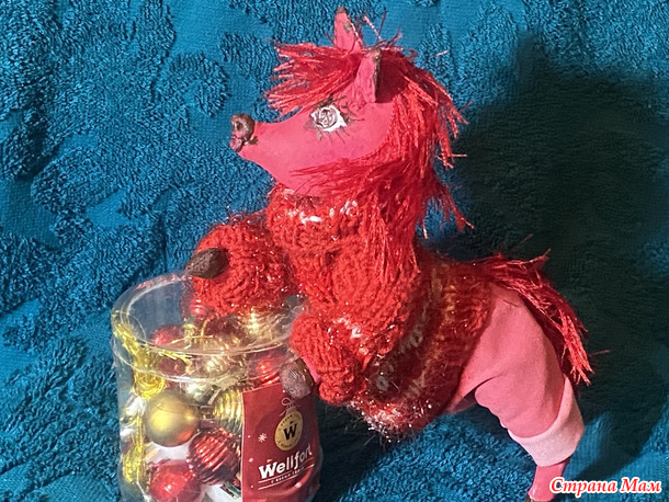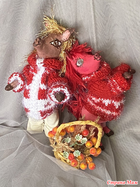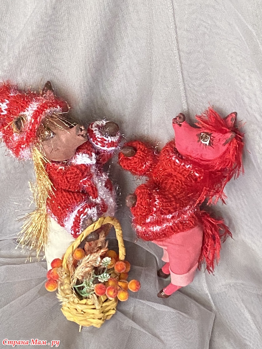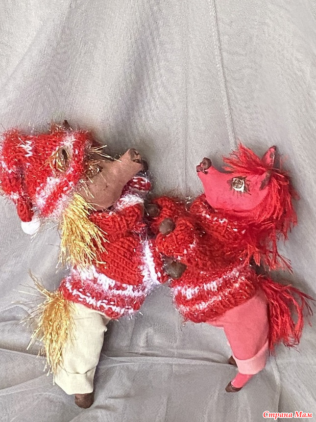 Гривы и хвосты - из травки, соответственно красной и золотой. А свитерочки и шапочки связаны из красных акриловых ниток и белого Кристмаса.