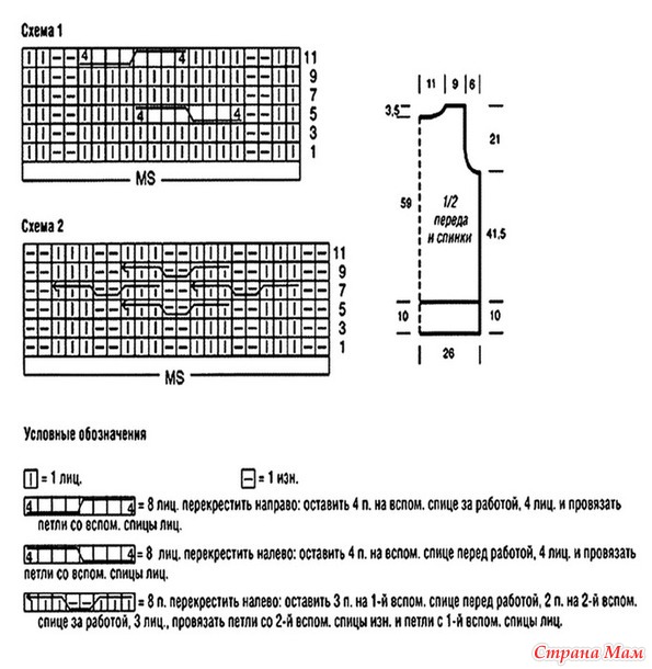 Коса А (ширина 20 п.): вязать по схеме 1, на которой приведены только лиц. р., в изн. р. петли вязать по рисунку.