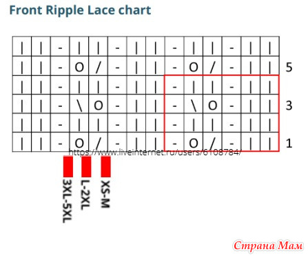 o Провязать по схеме узора "Ripple" 2 петли (см. схему для вашего размера)