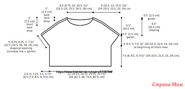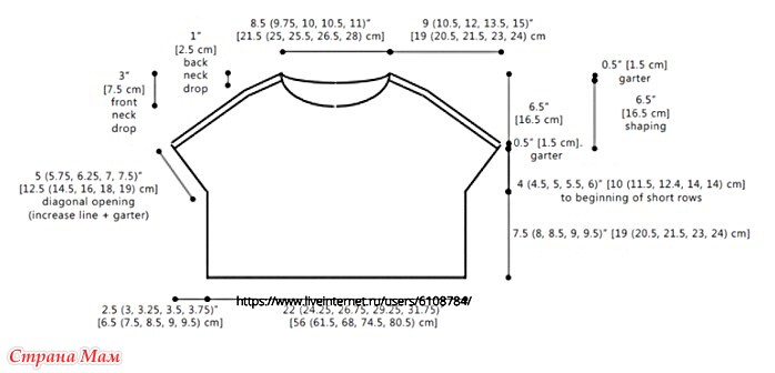 Для груди 63.5: (6 лиц, M1) 13 раз, 3 лиц—94 петли.