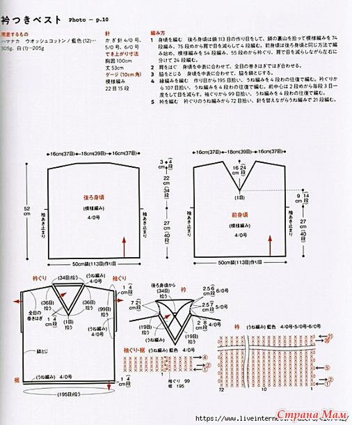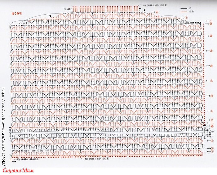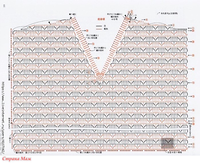 1. Вязание основной части изделия. Для спинки наберите 113 воздушных петель, поднимите заднюю часть цепочки и провяжите 74 ряда узором, затем с 75-го ряда убавьте петли в области плеч и провяжите 4 ряда лицевыми. Для передней части изделия начните вязать так же, как и спинку, провяжите 54 ряда узором, затем с 55-го ряда убавьте петли в области горловины и плеч и провяжите 24 ряда лицевыми, разделив их на левую и правую стороны.