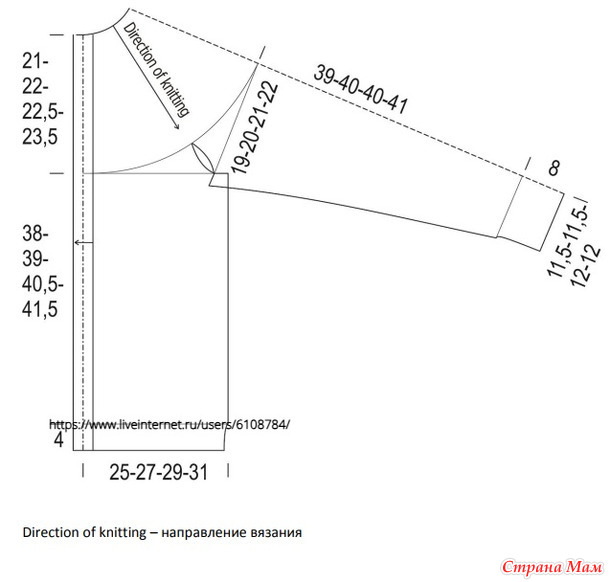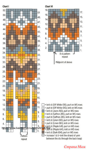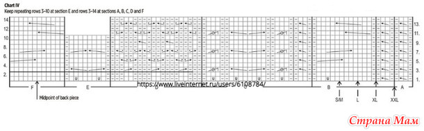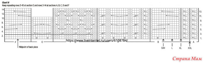 Примечание: При высоте детали приблизительно 30(31)31(32)см начните вязание жаккардового узора с 1 ряда схемы VI. Середина детали выделена стрелочкой, используйте ее для определения начала вязания узора. Свяжите 2-18 ряд схемы.