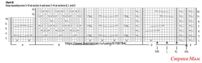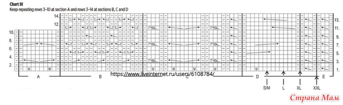 Keep repeating rows 3-10 at section A and rows 3-14 at sections B, C and D – повторяйте ряды 3-10 секции А и ряды 3-14 секций В, С и D.