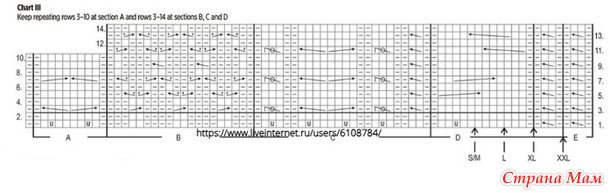 В работе 54(58)62(66)п переда. Начните вязать узор с косами по лицевой стороне с 1 ряда схемы III: наберите 1п, начните вязание от места, выделенного для Вашего размера *= 5+1п (9+1п) 13+1п (17+1п) секции D], вяжите секцию С (= 20+4п), секцию В (= 20п), секцию А (= 8+2п) и еще 1п с левой стороны. Прибавлены 8п. На спицах 62(66)70(74)п. Свяжите 2 ряд схемы, затем продолжайте повторять ряды 3-10 секции А и ряды 3-14 секций В, С и D.