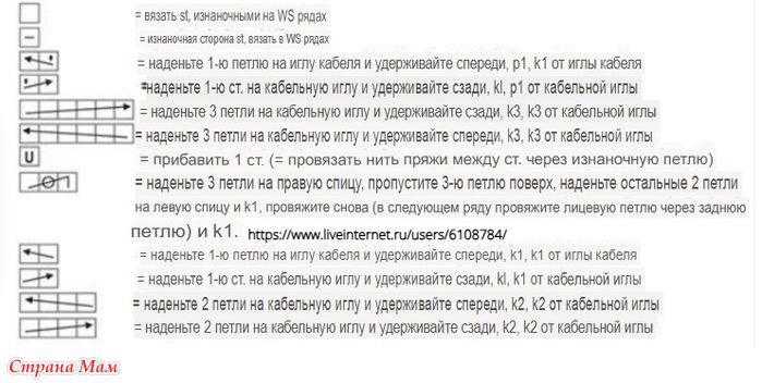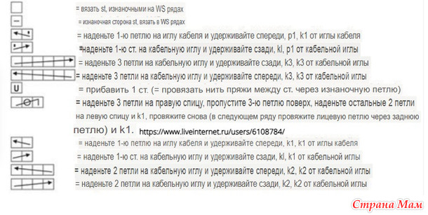 Slip 3st onto the cable needle and hold in back, k3, k3 from the cable needle – переведите 3п на вспомогательную спицу и держите ее на изнаночной стороне работы, 3л.п, 3л.п со вспомогательной спицы.