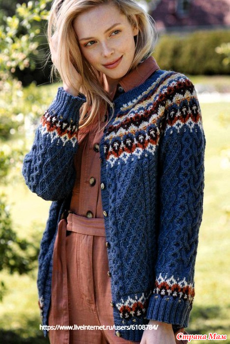 Кардиган с жаккардовым узором «БОХУС» от Sisko Skivi. Спицы.