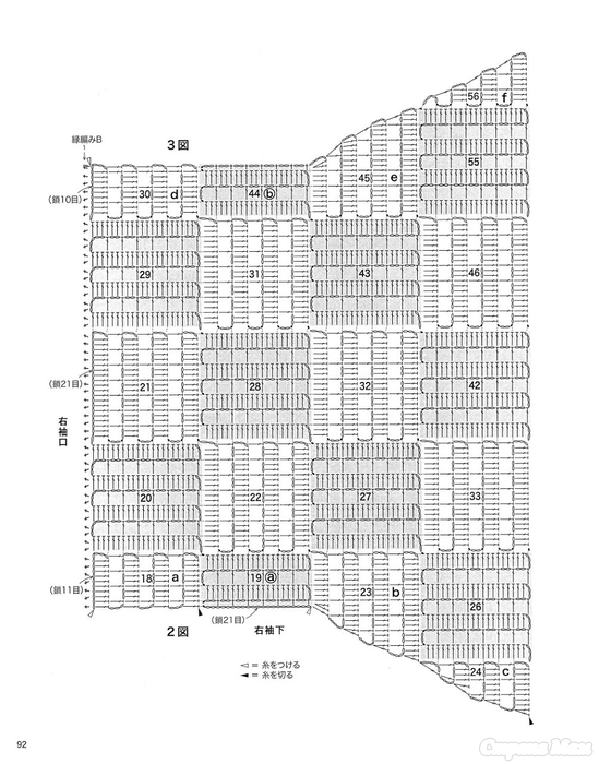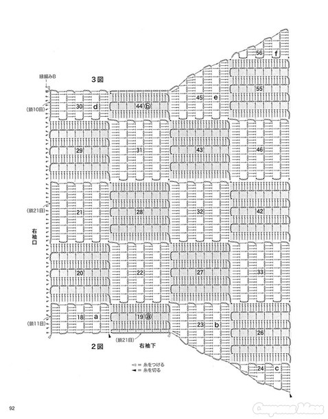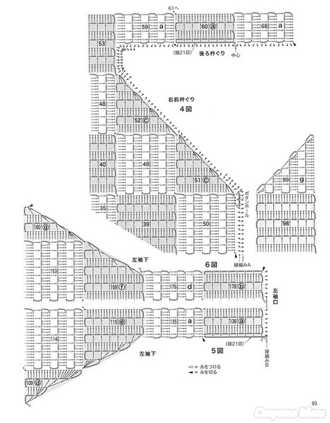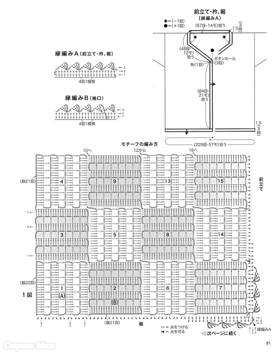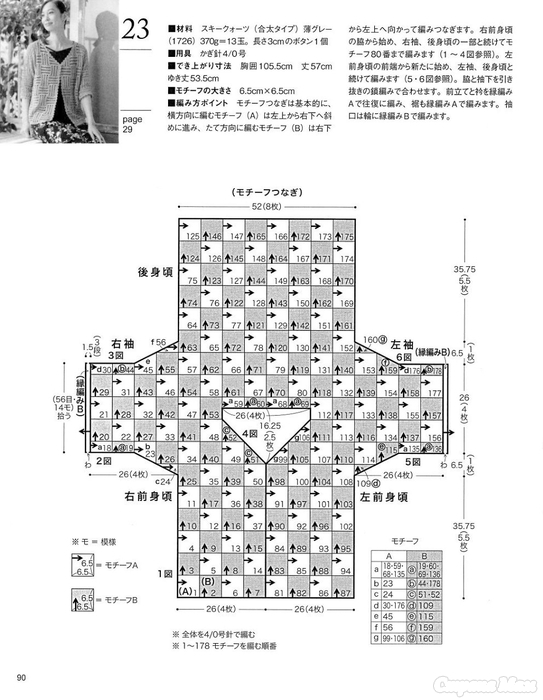 Начните с боковой стороны правой передней части изделия и продолжайте вязать правый рукав и часть спинки до мотива номер 80 (см. схемы 1-4). Снова начните с переднего края передней части изделия и продолжайте вязать левый рукав и спинку (см. схемы 5 и 6). Соедините боковые стороны и проймы соединительной петлей. Провяжите планку и воротник лицевыми и оборотными петлями обвязки А, а также обвяжите нижний край. Провяжите манжеты по кругу обвязкой В.