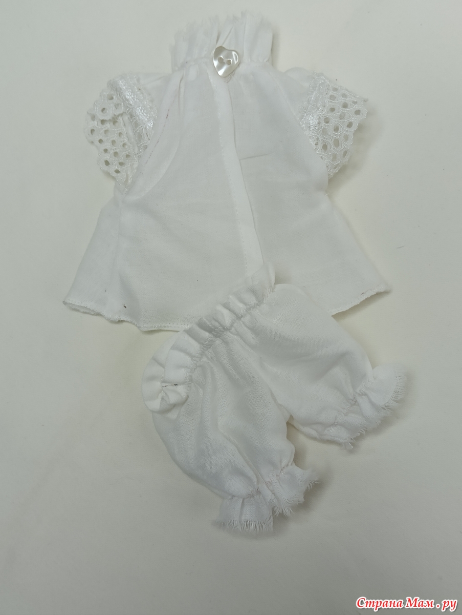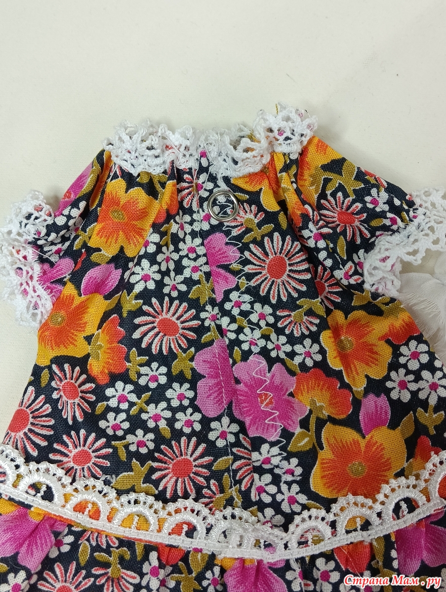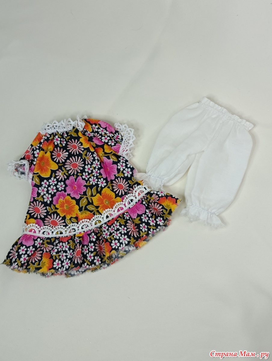 Решила, еще сшить несколько нарядов для куклены, здесь в пестром платьице и панталончиках))