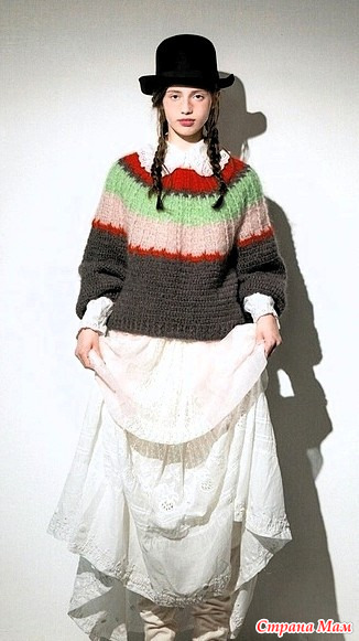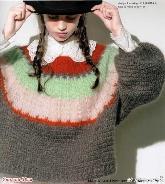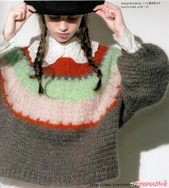 Этот симпатичный свитер с круглой кокеткой отличается яркой цветовой гаммой и пушистой текстурой пряжи. Он связан из более толстой пряжи, поэтому его легко вязать, и он рекомендуется тем, кто впервые пробует свои силы в вязании чего-то большого.