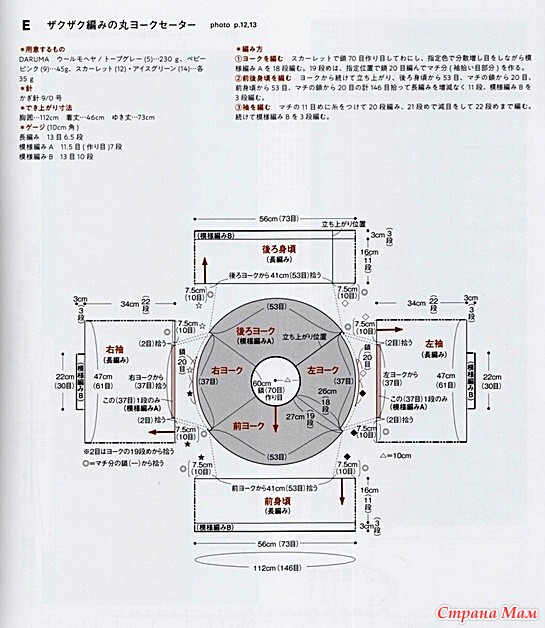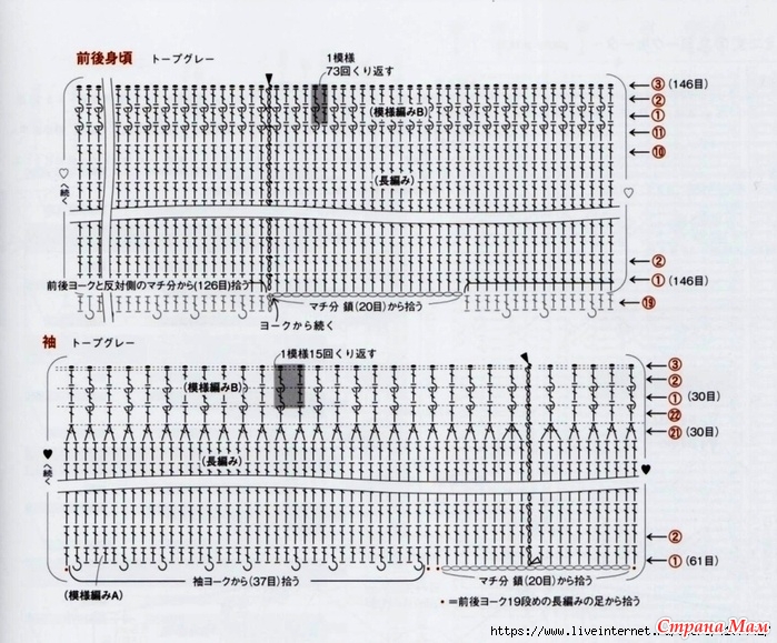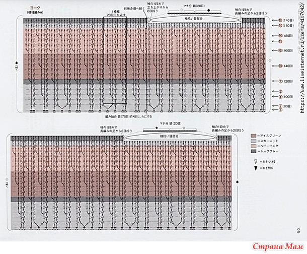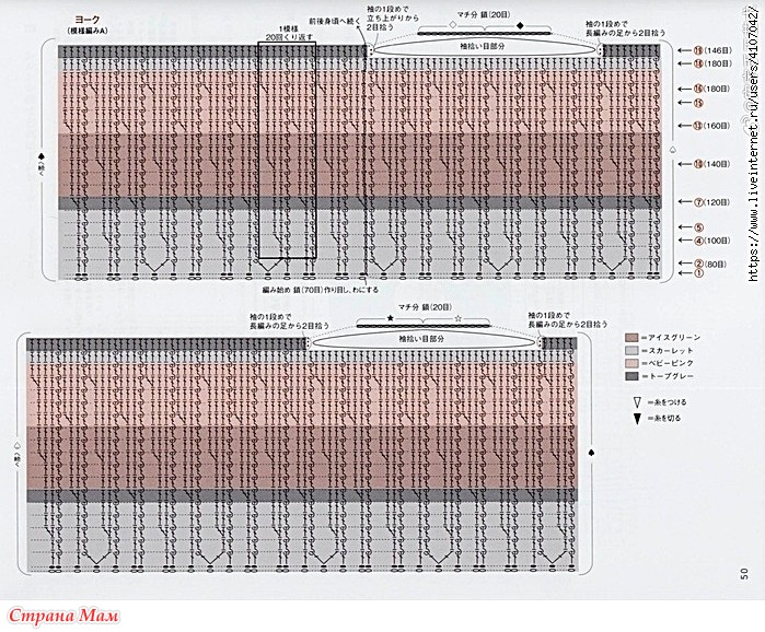 ③ Свяжите рукава. Прикрепите нить к 11-й петле клина и провяжите 20 рядов, затем убавьте на 21-м ряду и провяжите до 22-го ряда.
