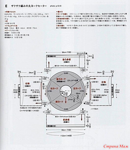 ② Свяжите переднюю и заднюю части тела. Продолжайте вязание с кокетки. 53 петли от задней части тела, 20 петель от цепочки клина, 53 петли от передней части тела, 20 петель от лицевой стороны клина, всего 146 петель. Провяжите 11 рядов столбиков с накидом без прибавок и убавок, а затем лицевыми петлями узора.