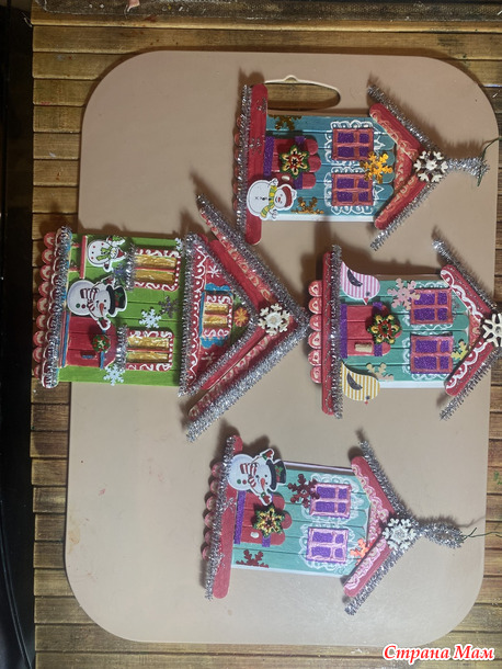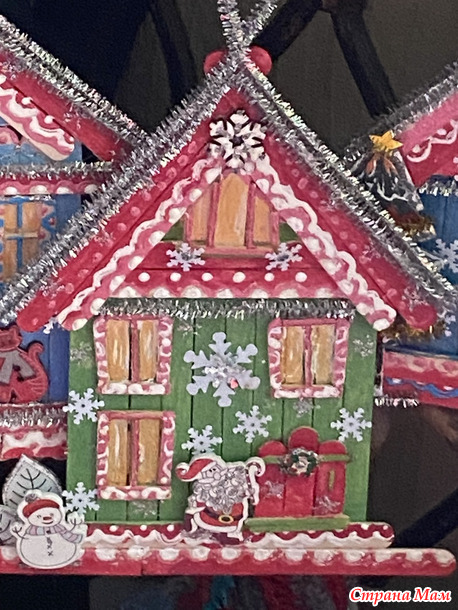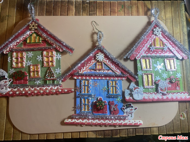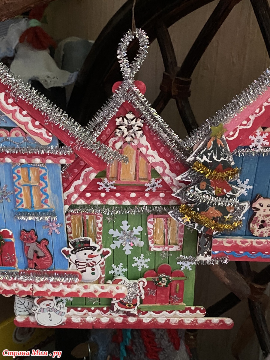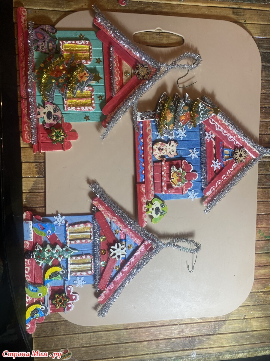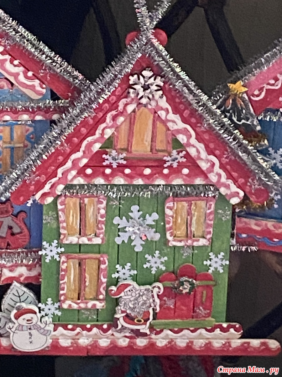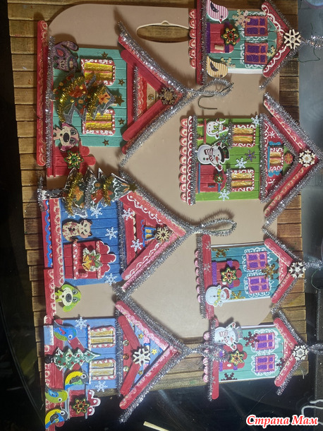 Домики легко можно повесить на елки, или создать гирлянды из домиков, Шаров и прочих наряжательных штучек. А можно создать красивые большие настенные панно. В общем, ЭТИ домики явно у меня не последние. Запас палочек есть!