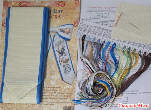 Кроме мулине там есть ещё ленточка рафии (растение). Я не поняла сначала её наличия, а потом, когда стала знакомиться с инструкцией, то увидела, что из неё небольшие бантики завязываются и крепятся на вышитое гнёздышко, а на превью набора я этого не заметила. Лента кремового или очень бледного жёлтого цвета уже с обработанными краями голубой косой бейкой. Это конечно же очень удобно, всё в наборе, никакого подбора, но не так бюджетно, как найти схемы на Пинтерест, например, и подобрать из остатков ниточки. Кому что. Я посчитала для себя удобным вариант покупки набора.