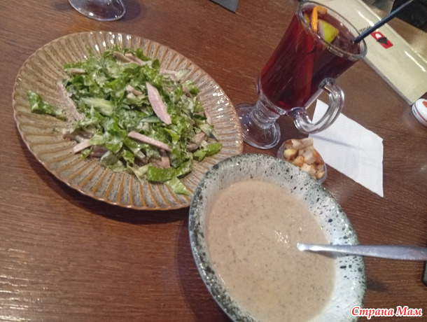 Мой обед состоял из грибного суп пюре. Что то мне вилку к этому пюре не принесли . Пришлось просить хотя бы к салату. Салат из зелени, огурца и говяжьего языка. Гюссан называется. Очень вкусно. Ни в первый раз беру в этом ресто- баре этот салат, а вот суп - пюре впервые. Ну и напиток - безалкогольный глинтвейн. Это тот самый, который я как то расхваливала тут на форуме.