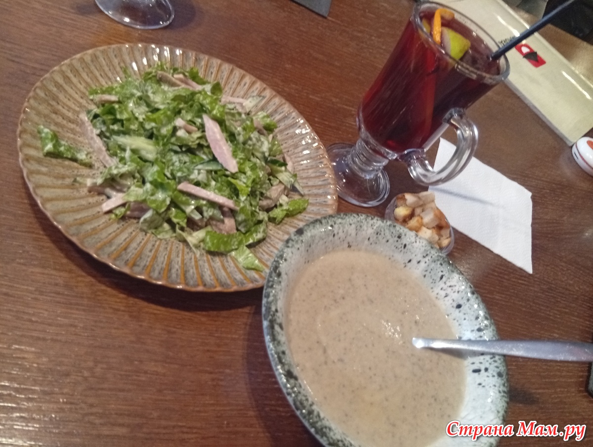 Мой обед состоял из грибного суп пюре. Что то мне вилку к этому пюре не принесли . Пришлось просить хотя бы к салату. Салат из зелени, огурца и говяжьего языка. Гюссан называется. Очень вкусно. Ни в первый раз беру в этом ресто- баре этот салат, а вот суп - пюре впервые. Ну и напиток - безалкогольный глинтвейн. Это тот самый, который я как то расхваливала тут на форуме.