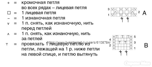 Работу продолжить основным узором, вязать между кром. по схеме В.