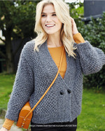 Пряжа 1 (75% хлопка, 25% вискозы; 50 г/110 м) — 7 (8) 9 мотков цвета антрацита; пряжа 2 (85% хлопка, 15% полиамида; 50 г/ 150 м) — 6 (7) 8 мотков темно-серой; спицы №8; 2 кожаные пуговицы диаметром 27 мм.