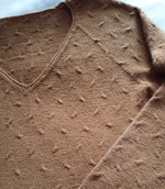 Так как мне не нравится, как смотрятся узоры в перевёрнутой виде, да и вообще не хотелось перегружать платье узорами, решила просто использовать местами переплетения. Ну и чтобы линия реглана не выглядела прямой линией, местами её искривила) .