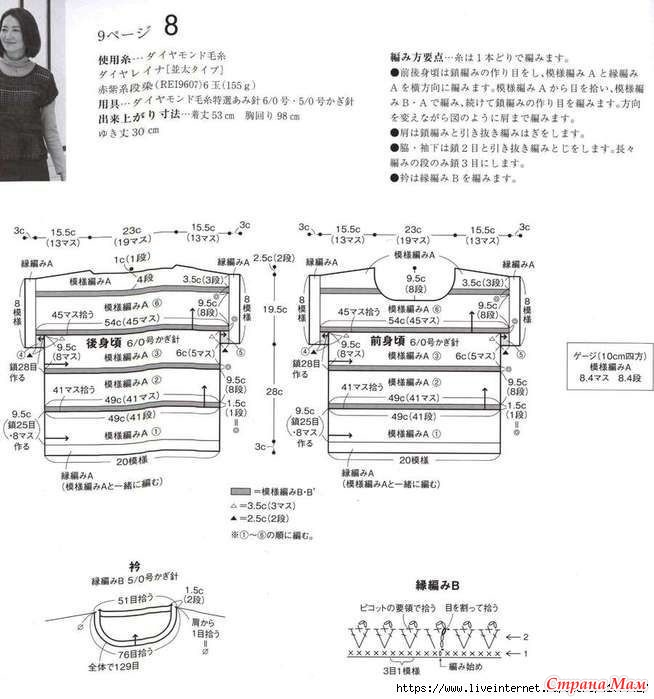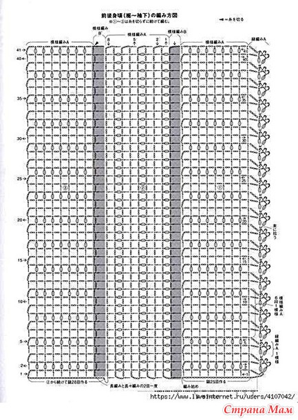 Для передней и задней части тела наберите воздушную петлю, затем провяжите узорчатую петлю А и окантовочную петлю А горизонтально. Поднимите петли узорчатой ​​петли А и провяжите узорчатые петли В и А, затем наберите воздушную петлю. Изменив направление, провяжите до плеча, как показано на схеме.