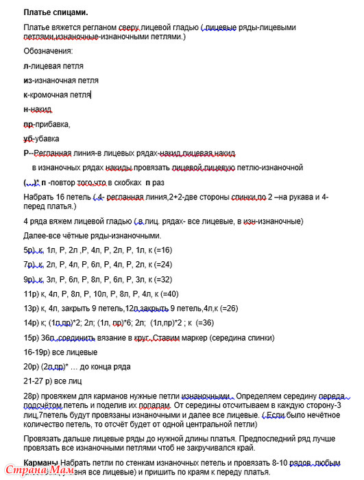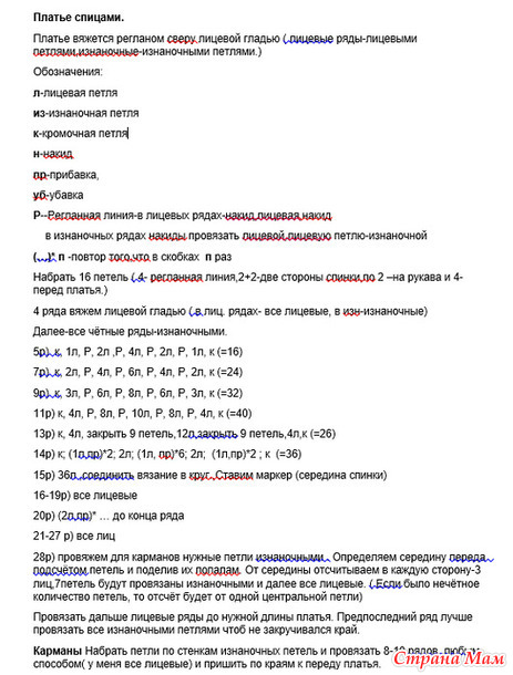 Платье я вязала на спицах,по диаметру близкими к крючку. (крючок 1,5 а спицы у меня 2,0)