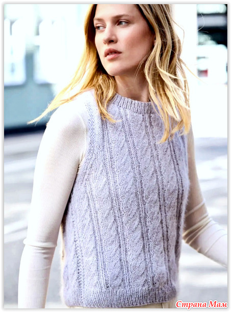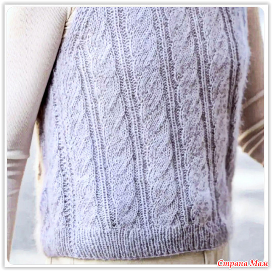Серебристо-серый жилет с круглым вырезом и фактурными косами. Спицы.