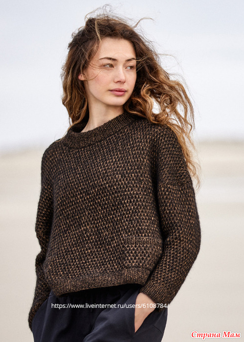 Материал: Lana Grossa-Qualität „Puno Due“ (63 % хлопок, 37 % (беби) альпака, длина нити = ок. 210 m/50 g): ок 300 (350–400) г нуга/чёрно-коричневый (цв 6); сп. № 4 и 4,5, 1 кр. сп. № 4.