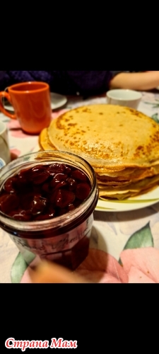 Сказано - сделано! Блины на ужин. С самодельным вареньем вишневым. И даже вишня со своего садика. И никакого золота
