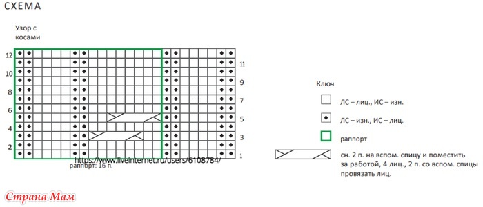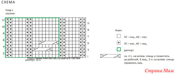 Узор. Р. 1 (ЛС): 1 лиц., вязать по 1му р. схемы узора до 1 посл. п., 1 лиц.