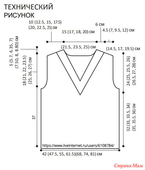 ОДНОВРЕМЕННО вязать по узору на длину от проймы 19.5 (21, 22, 23.5)(25, 26, 27) см, закончив изн. р.