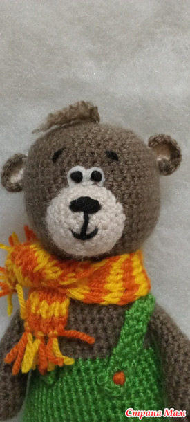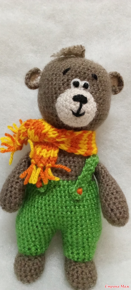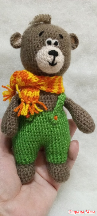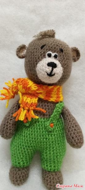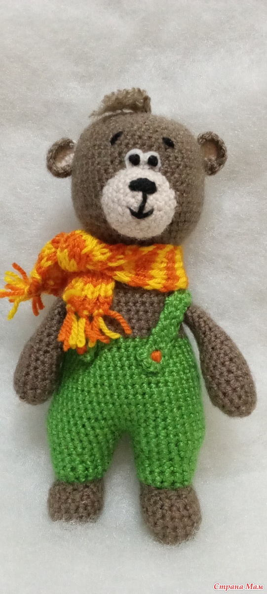 Мне показалось, что зелёный с жёлто-оранжевым прекрасно смотрятся на мишке цвета Капучино. Тем более, что этот зелёный цвет на штанишках называется "Горох". Всё вкусно - капучино, молодой горошек, апельсины оранжевые.... Не знаю, как все эти продукты между собой в еде сочетаются, но смотрятся нарядно