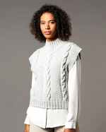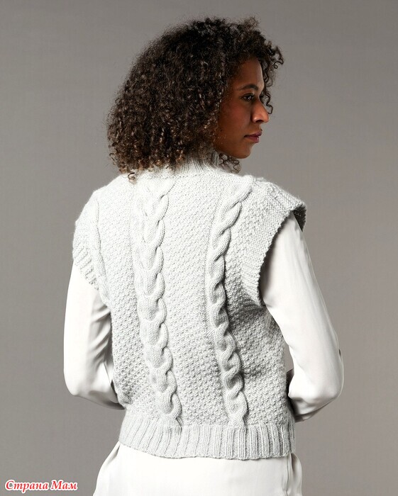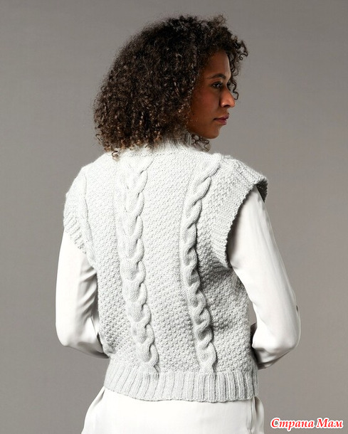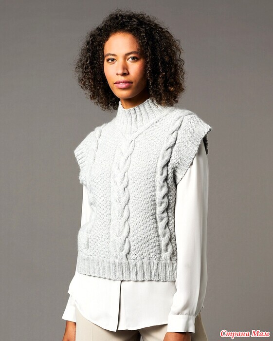 Серая безрукавка с воротником-стойка и «косами». Спицы.