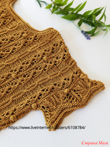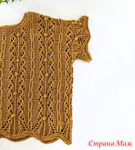 Верхняя часть вяжется по кругу снизу вверх до пройм. Ажурный узор всегда располагается на лицевой стороне, что облегчает вязание. Передняя и задняя части обрабатываются плоским полотном. Швы горловины соединяются, а горловина и рукава обрабатываются.