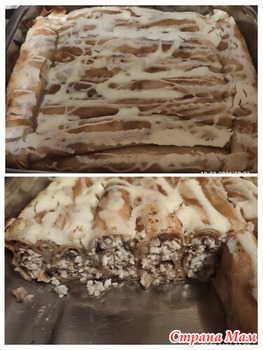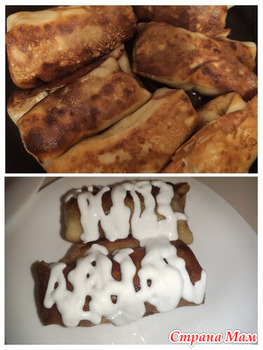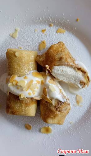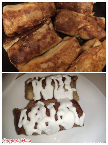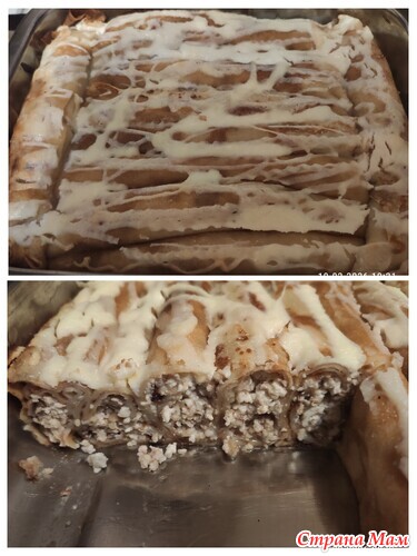 Блины с творгом и грецкими орехами. Их скрутила трубочками, сложила на противень, вымазала сметаной и присыавла сазаром. Запихнула в духовку. Все, программа минимум выполнена!!!)))