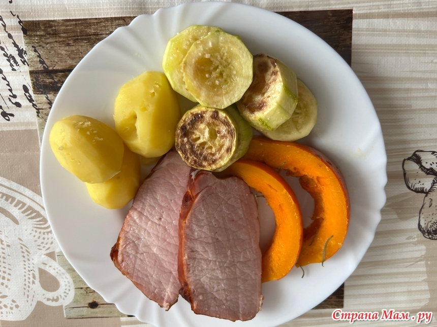 К ней запечённая тыква, кабачок и отварная картошка