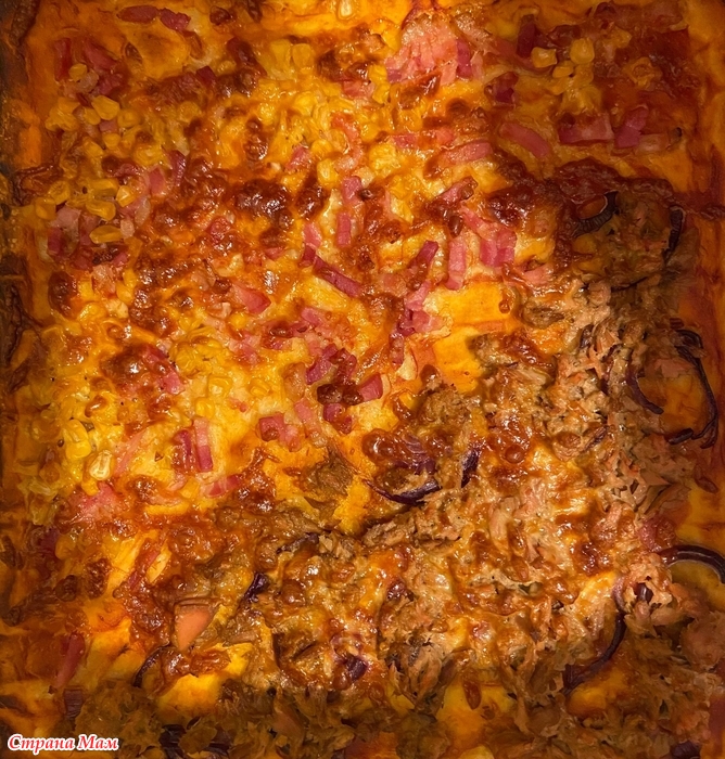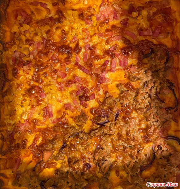 Половина с тунцом, половина с беконом и кукурузой.