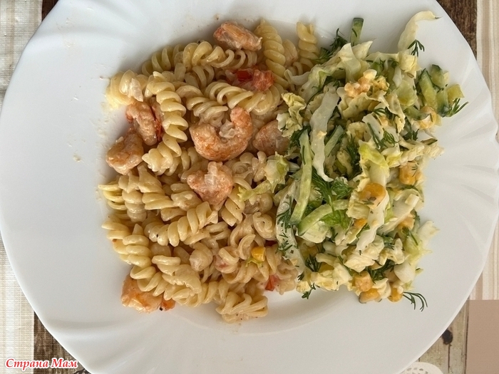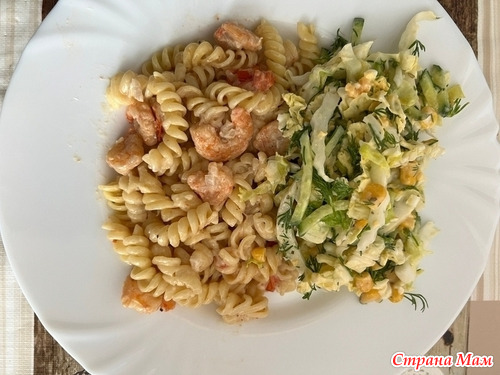 Макароны с креветками в сливках и салат из пекинской капусты, огурца, укропа и яйца
