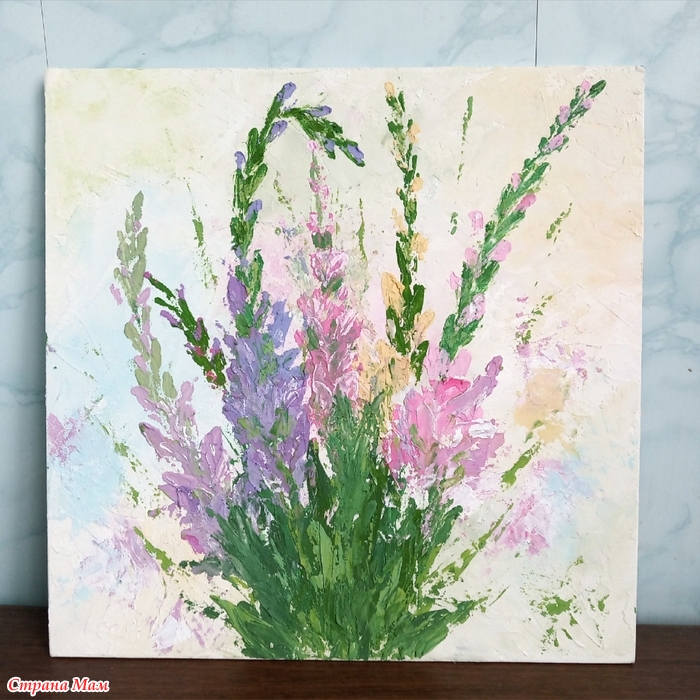 "Букет" - первая работа с этим материалом. Шпаклёвка заранее смешана с акриловыми красками и выкладывается на холст мастихином.