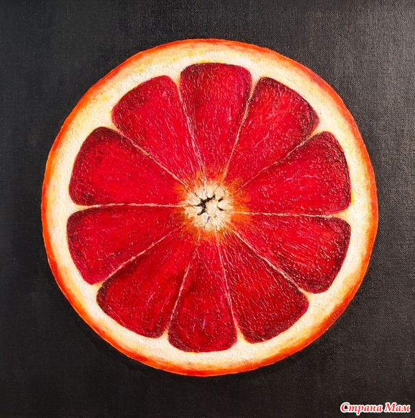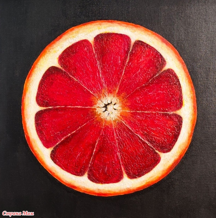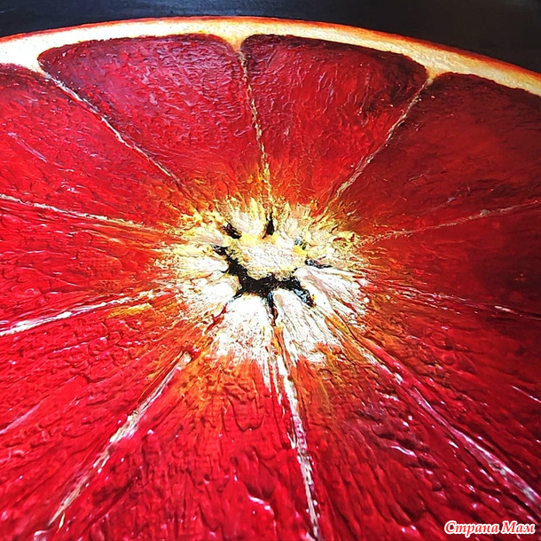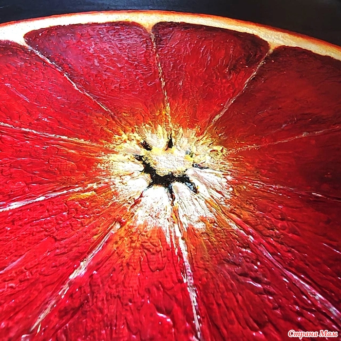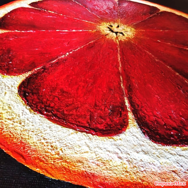 "Сицилийский апельсин". Та же техника - сначала лепится фактура шпаклёвкой, потом идут в ход акриловые краски. Здесь, кстати, два вида текстурных паст - одна даёт бОльший объём, другая деликатно подчёркивает структуру.