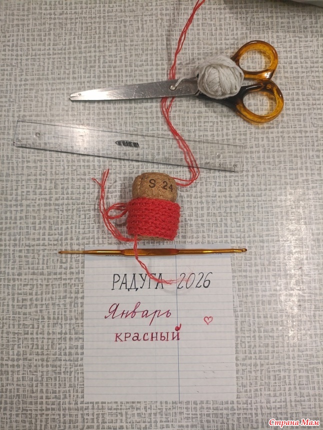 Материалы - остатки ниток, крючок, набранные в этом году пробки.